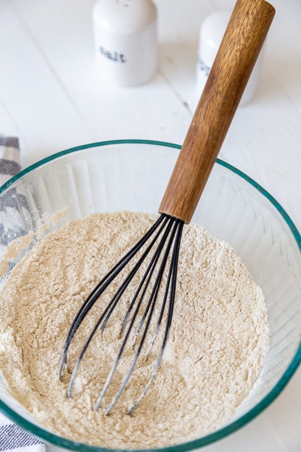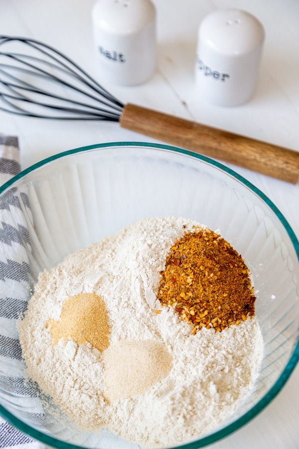 - In a large bowl, whisk the 2 cups vital wheat gluten with the 1 tsp garlic powder, 1 tsp onion powder, ½ tsp salt, and 1 tbsp chicken seasoning until they’re completely combined.